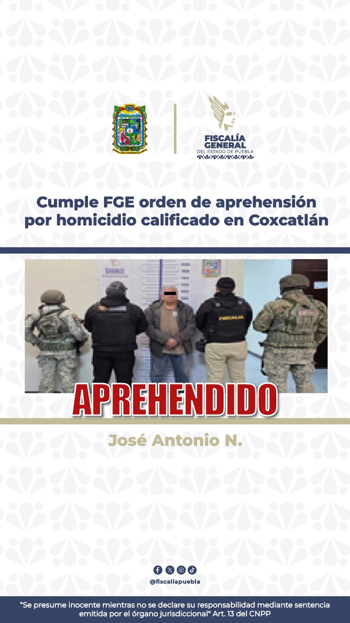 El detenido fue puesto a disposición del Juez de Control de la Región Judicial Sur Oriente, con sede en Tehuacán, en espera de la audiencia inicial correspondiente.