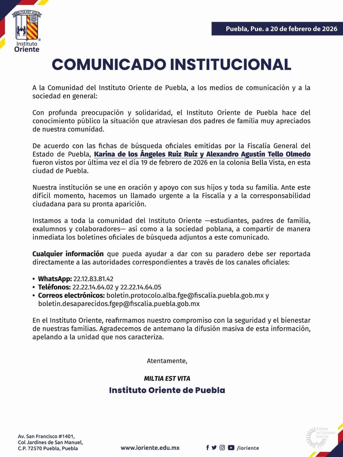 El Instituto Oriente de Puebla exige la localización del matrimonio reportado como desaparecido, Karina de los Ángeles Ruiz Ruiz y Alexandro Agustín Tello Olmedo, quienes también son padres de familia de la comunidad estudiantil.