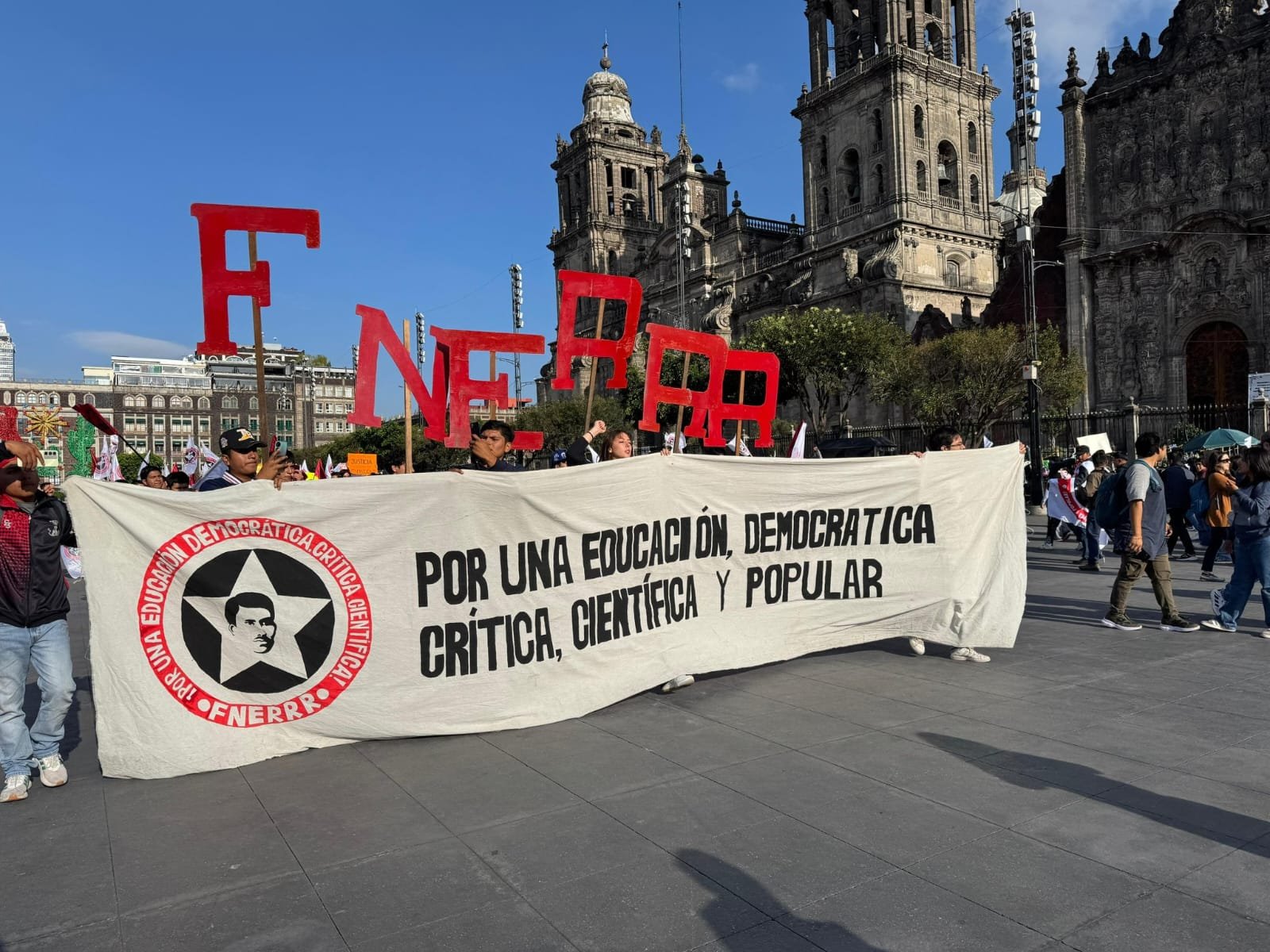 La protesta de cientos de jóvenes de la Federación Nacional de Estudiantes Revolucionarios “Rafael Ramírez” (FNERRR) frente a Palacio Nacional se disolvió después de más de cuatro horas, al no obtener respuesta del gobierno federal.