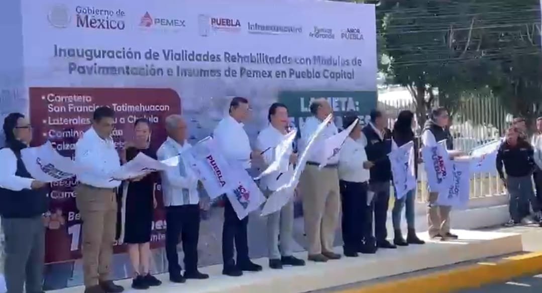 El gobernador Alejandro Armenta Mier inauguró este jueves las siete vialidades rehabilitadas en la Recta a Cholula, con los módulos de pavimentación adquiridos por el Estado y los insumos donados por Petróleos Mexicanos (Pemex).